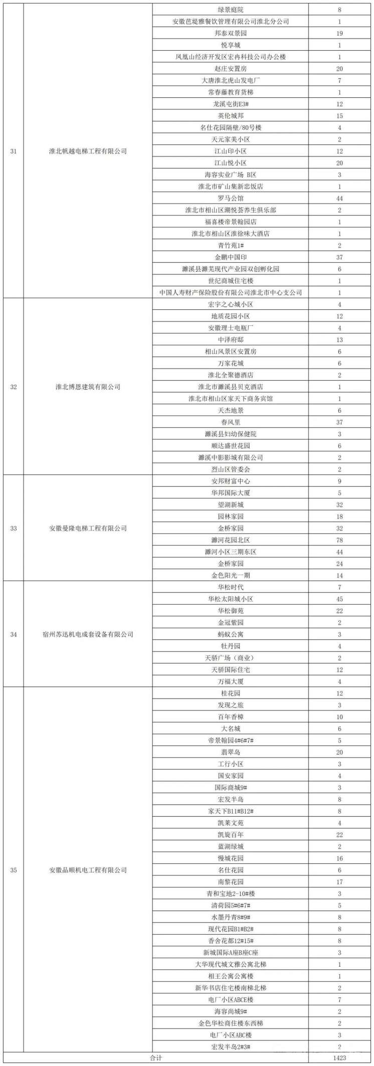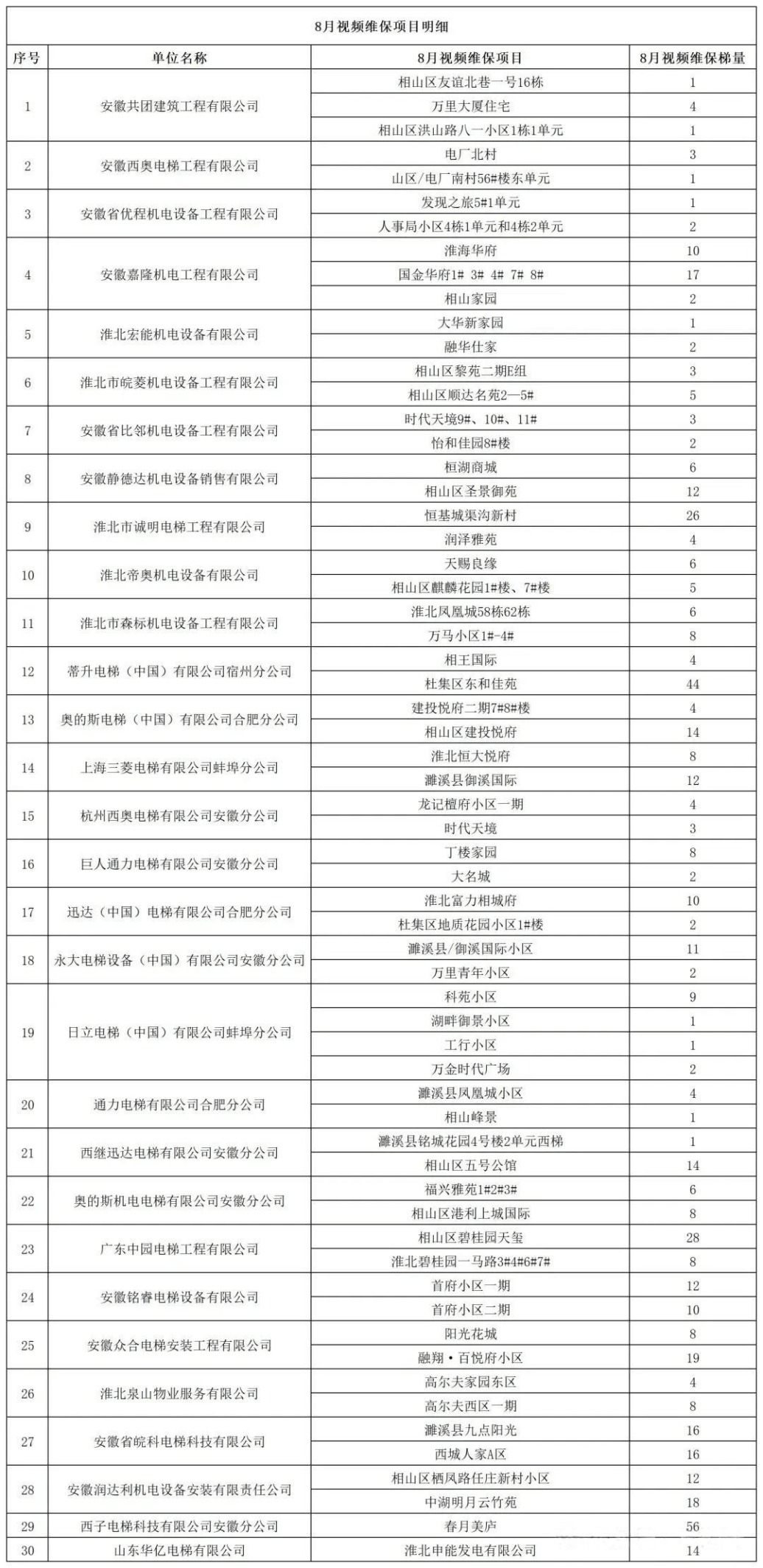 为进一步规范淮北市电梯使用管理及维护保养工作=▽★◇☆,切实提升电梯安全保障水平□■•☆,保障市民乘梯安全☆△,同时增强电梯使用管理与维保工作的透明度◇◇•,便于社会公众进行监督•▷●○。日前▪▽★▲,淮北市电梯行业协会公布淮北市市7月份和8月份电梯维保全过程影像记录项目的公示◇□■,8月份视频维保共有35家单位合计电梯1423台••○。以下是单位及项目详情●=◁: